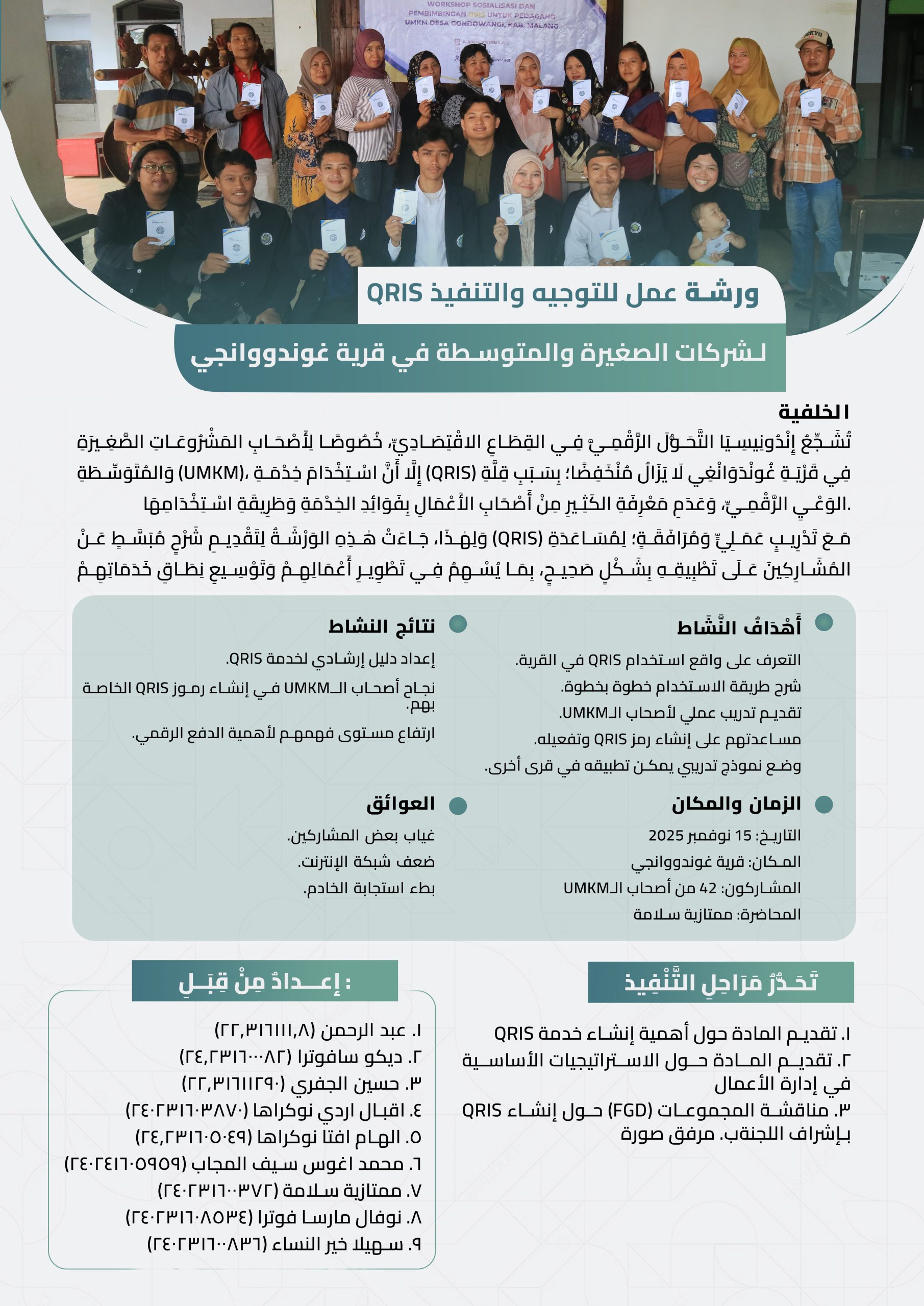 Kegiatan ini mencatatkan hasil positif dengan suksesnya para pelaku UMKM membuat kode QRIS untuk usaha mereka masing-masing. Selain itu, pemahaman peserta mengenai pentingnya pembayaran digital meningkat signifikan. Sebagai tindak lanjut, panitia juga telah menyusun buku panduan (modul) penggunaan QRIS yang dapat digunakan sebagai acuan jangka panjang.Namun, pelaksanaan kegiatan bukan tanpa kendala. Panitia mencatat beberapa tantangan teknis di lapangan, seperti lemahnya jaringan internet di lokasi, respons server yang lambat saat proses registrasi massal, serta ketidakhadiran beberapa peserta undangan.